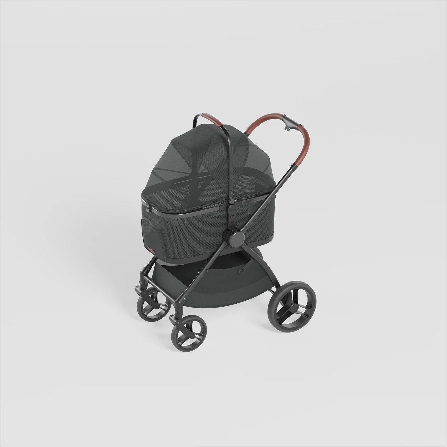 Angled side view of the P3 Pet Stroller with mesh carrier attached, showcasing breathable enclosure.
