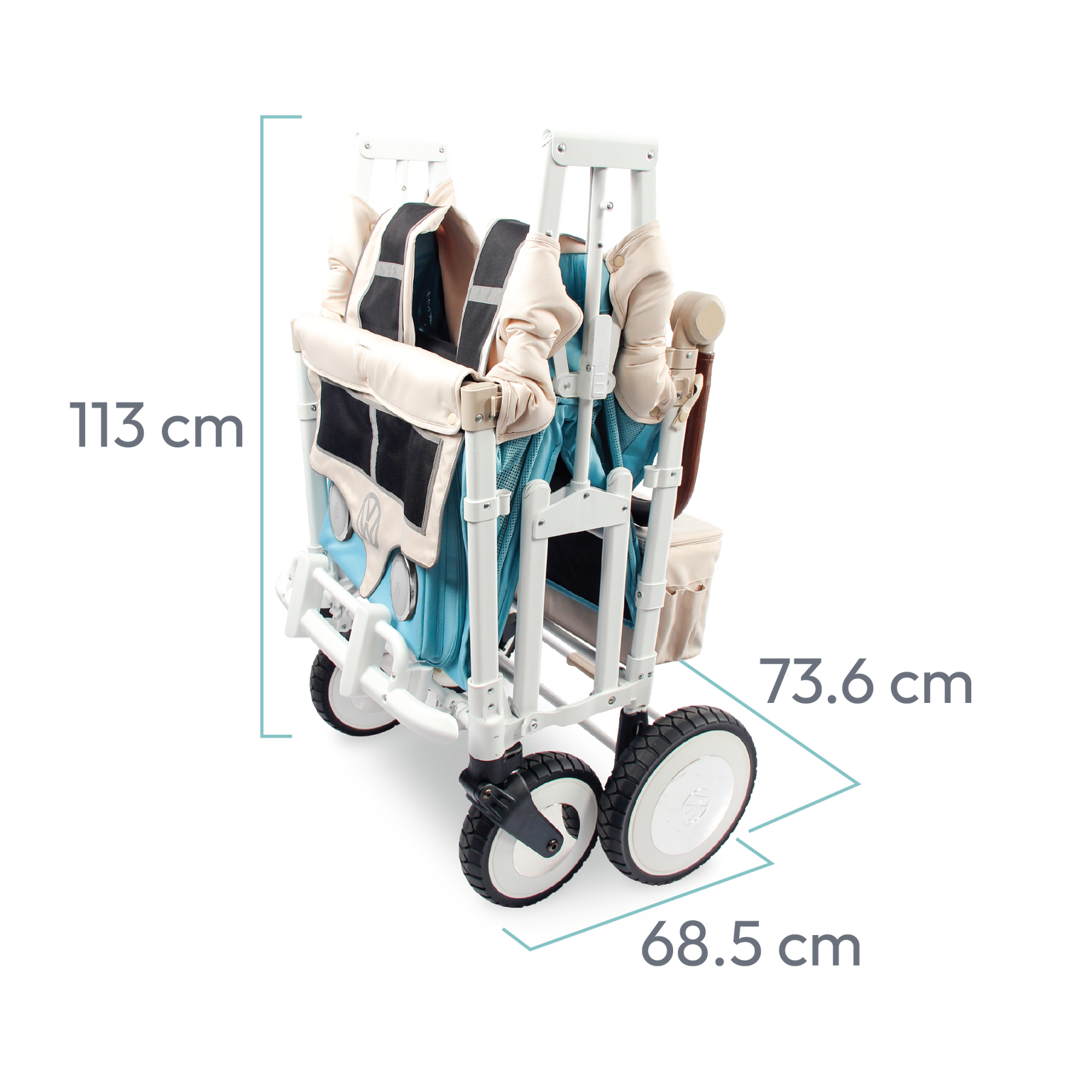 Stroller wagons just got a little more groovy. Inspired by the vintage VW bus, our new special edition stroller wagon will fulfill your nostalgic fantasies with all those classic WonderFold elements. It includes features like the classic VW bumper, functioning headlights, and retro all-terrain XL wheels!