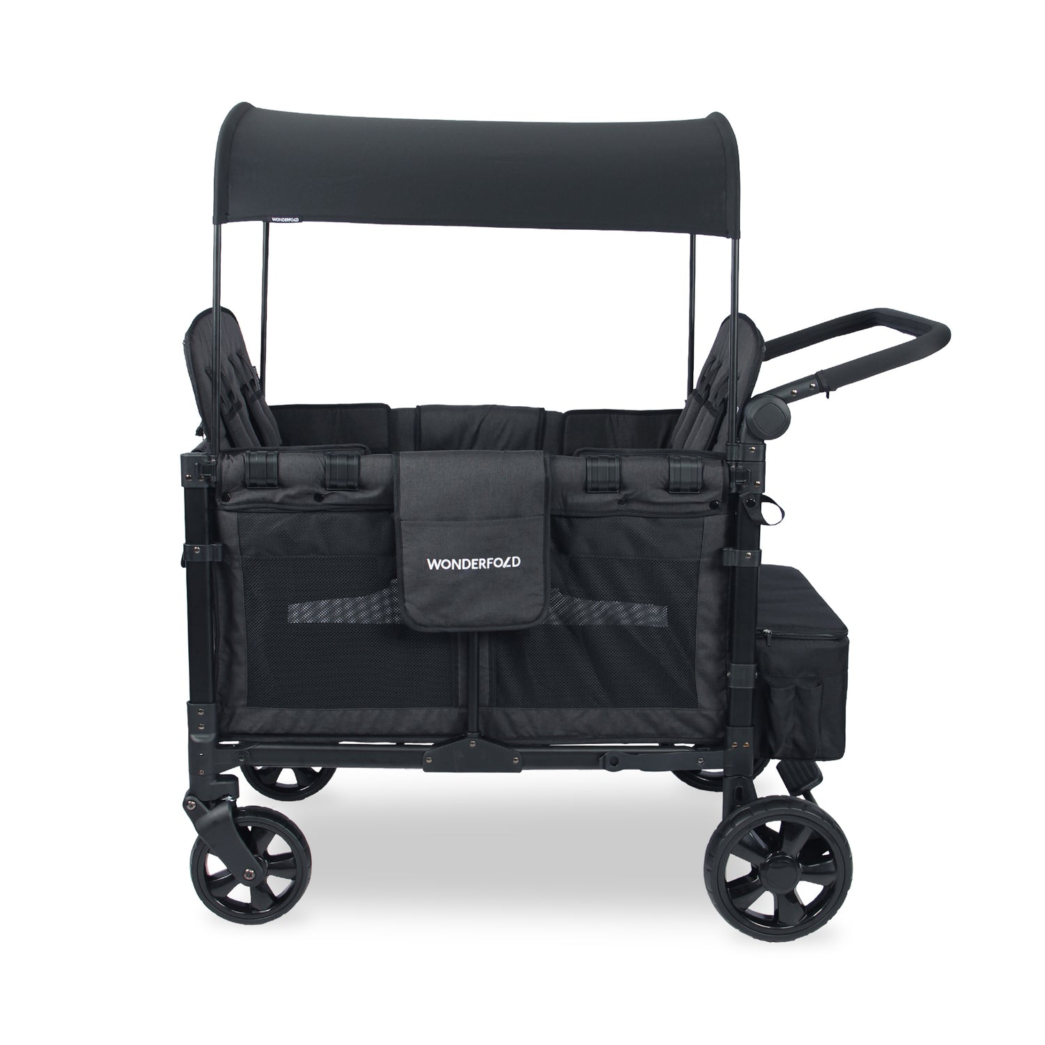 The W4 Elite offers a fabric, neoprene handlebar cover, all terrain EVA wheels, non-magnetic harnesses and does not offer added storage on the front of the rear basket.